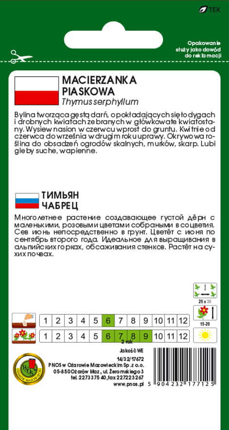 Macierzanka piaskowa jest niską, płożącą się zimozieloną krzewinką, która osiąga wysokość 5cm. W maju gdy zakwita jej fioletowe kwiatostany wyrastają ponad ogólna bryłę liści dodając jej do 10cm wysokości. Ze zdrewniałych łodyg wyrastają liście i łodygi kwiatostanowe. Liście choć drobne, są bardzo liczne tworząc zwarty zielony dywan. Uprawę warto rozpocząć od wysiewu – nasiona macierzanki piaskowej świetnie sprawdzą się na rabatach, murkach czy w ogrodach skalnych, tworząc efektowne, pachnące kobierce. Macierzanka nie ma specjalnych wymagań co do gleby, choć paradoksalnie lepiej udaje się na tych uboższych, z domieszką piasku.