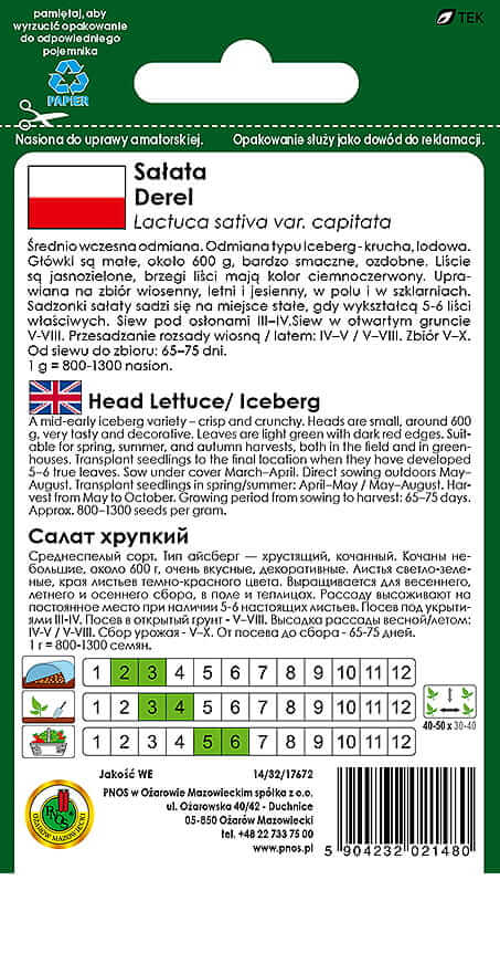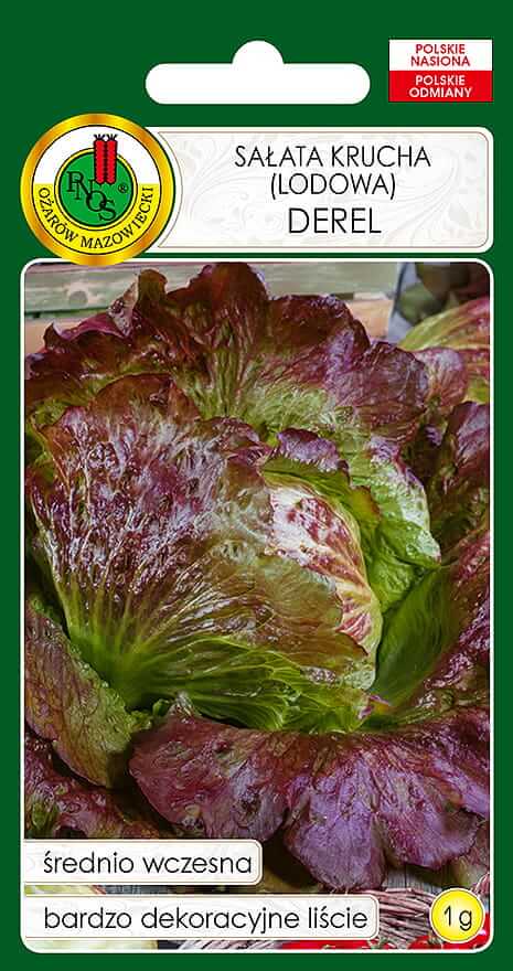 Odmiana sałaty lodowej, typu Iceberg, kruchej. Sałata Derej to odmiana średnio wczesna. Tworzy główki, które osiągają wielkość do 600g. Liście sałaty mają ozdobny wygląd, są bardzo smaczne. Są jasnozielone a ich brzegi przybierają kolor ciemnoczerwony. Odmiana sałaty lodowej Derel jest uprawiana na zbiór wiosenny, letni i jesienny, w polu i szklarniach. Sadzonki sałaty przesadza się na miejsce stały, gdy wykształci 5-6 liści właściwych.
